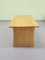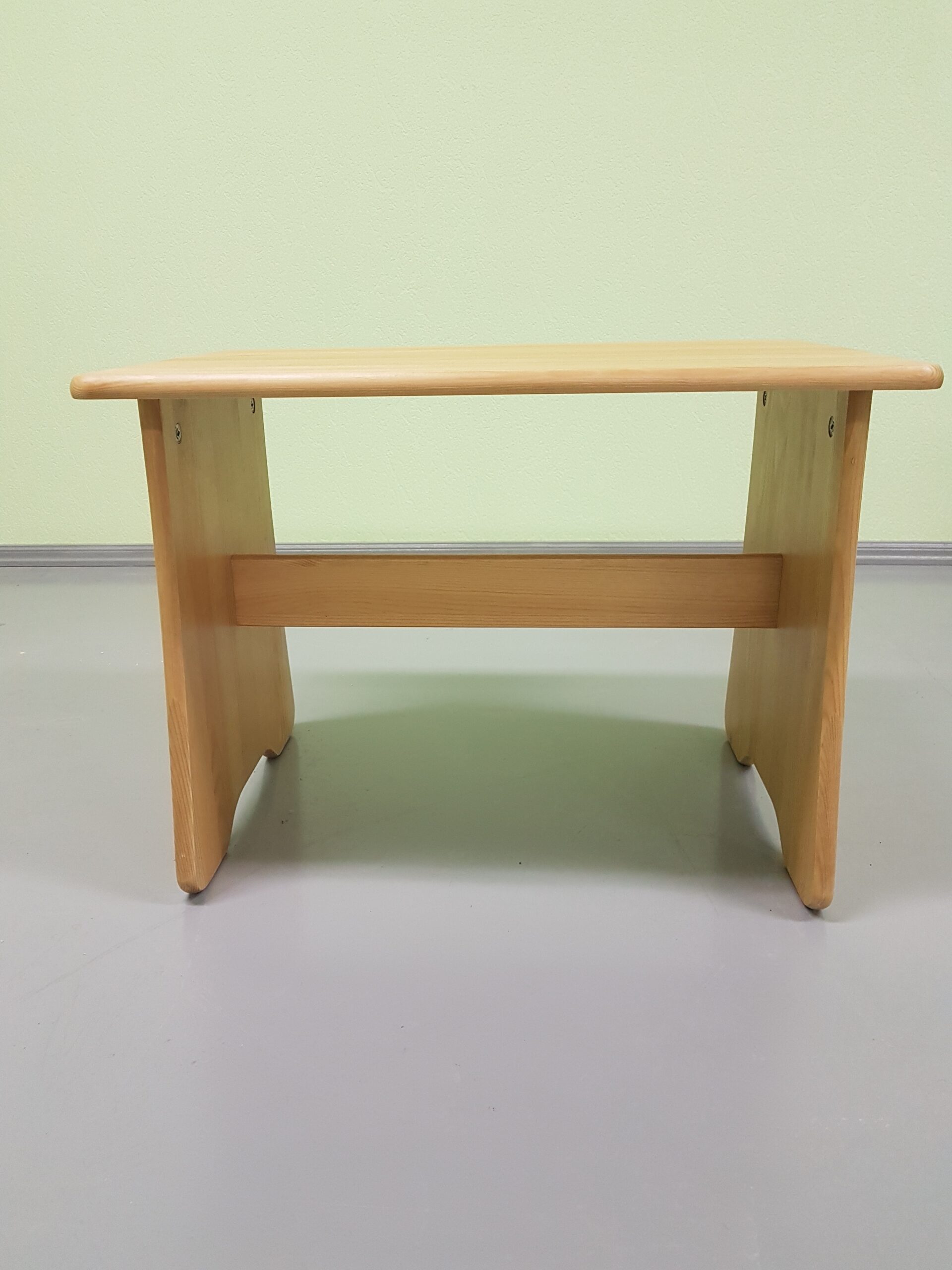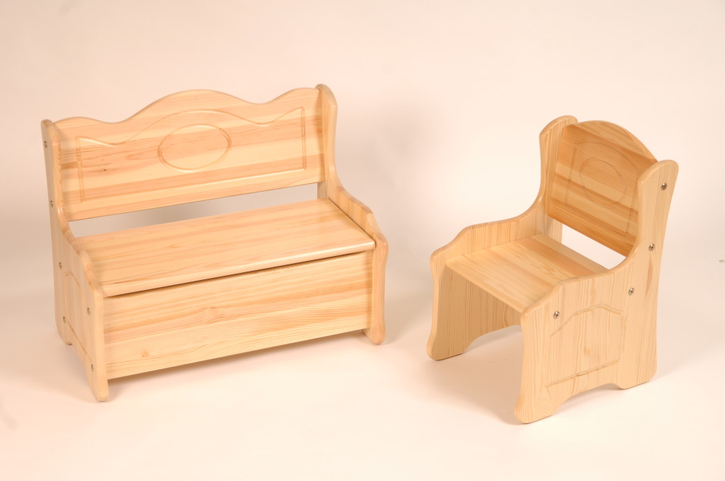 Bērnu komplekts – galdiņš, krēsliņš, soliņš ir ražots no Latvijā sastopamas priedes, kas ir lielisks risinājums augstas kvalitātes un estētiskās pievilcības iegūšanai. Katra mēbele ir izgatavota pēc augstas precizitātes un tā kā masīvkoks ir atbrīvots no zariem un citiem defektiem, kas būtu redzami uz virsmas. Praktiski jebkura vecuma bērns var justies ērti izmantojot šāda veida mēbeles. Krēsliņš un soliņš būs ērts sēdēšanai un dažādu spēļu spēlēšanai un nelielā galda. Katrs mēbeles stūris un mala ir pilnībā noapaļots tādējādi nodrošinot pret iespējamību sasities uzskrienot uz tās. Tā bieži notiek pat pieaugušajiem un, piemēram, atsitot pirkstu pret mēbeles stūri, var būt gaužām nepatīkami. Papildus lielās atzveltnes liks justies ērti un droši. Tās ir papildinātas ar vienkāršu ornamentu. Papildus ir iespējams izvēlēties dažādu toņu variācijas, kas palīdzēs pieskaņoties pārējam interjeram – sarkanbrūns, tumši brūns, gaiši brūns, melns, balts, kā arī gandrīz caurspīdīgs. Gaišāks tonis palīdzēs vairāk izcelt priedes dabīgo un neatkārtojamo struktūru. Šāds risinājums būs arī labākais mājīguma radīšanai.