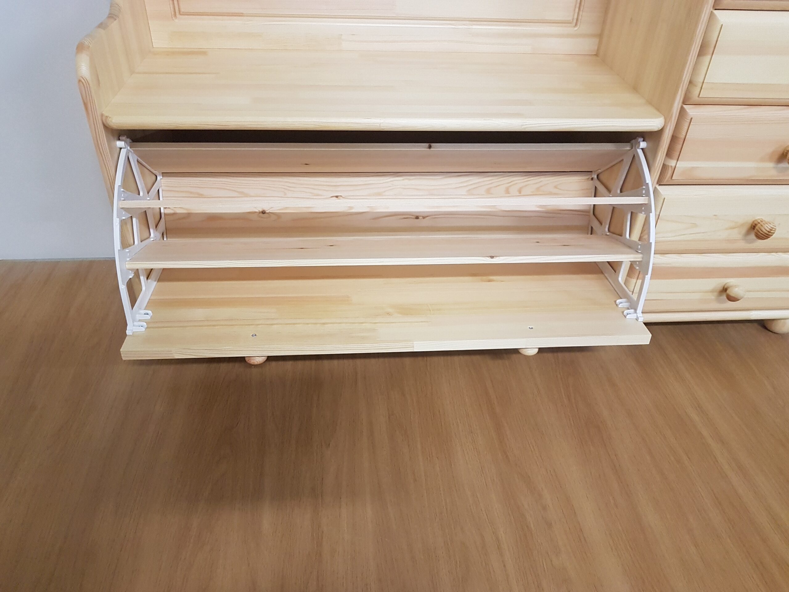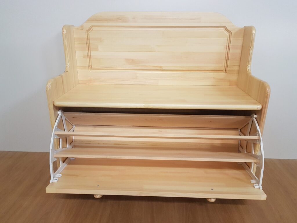 Dabīgās priedes masīvkoka priekšnama stūra apavu kaste būs lielisks risinājums telpas taupīšanai nezaudējot funkcionālo noderību.